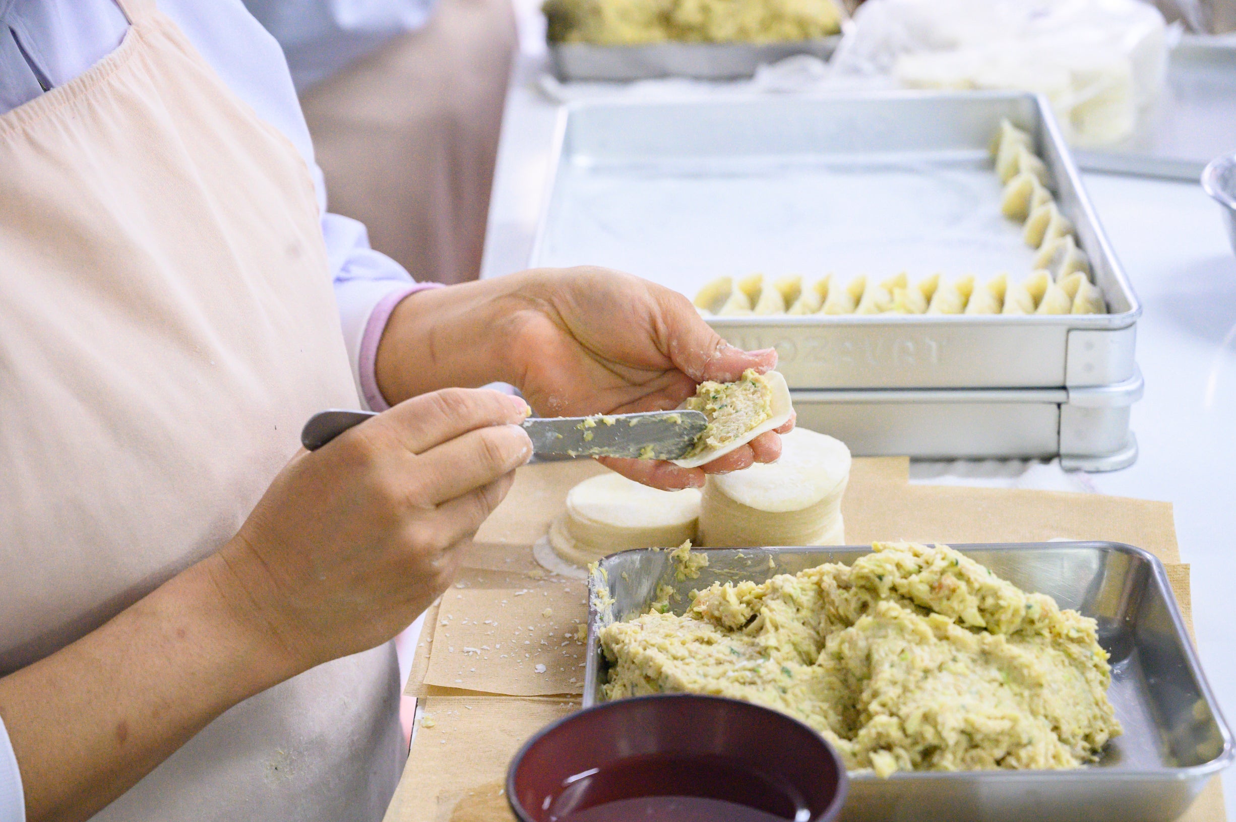 皮の"薄さ"にこだわり、水分量をあえて多くしている皮は機械では包めません。焼き上がりのフワッとした皮の食感と、餡の存在感をご堪能いただけるよう、季節によって野菜の切り方も調整しております。